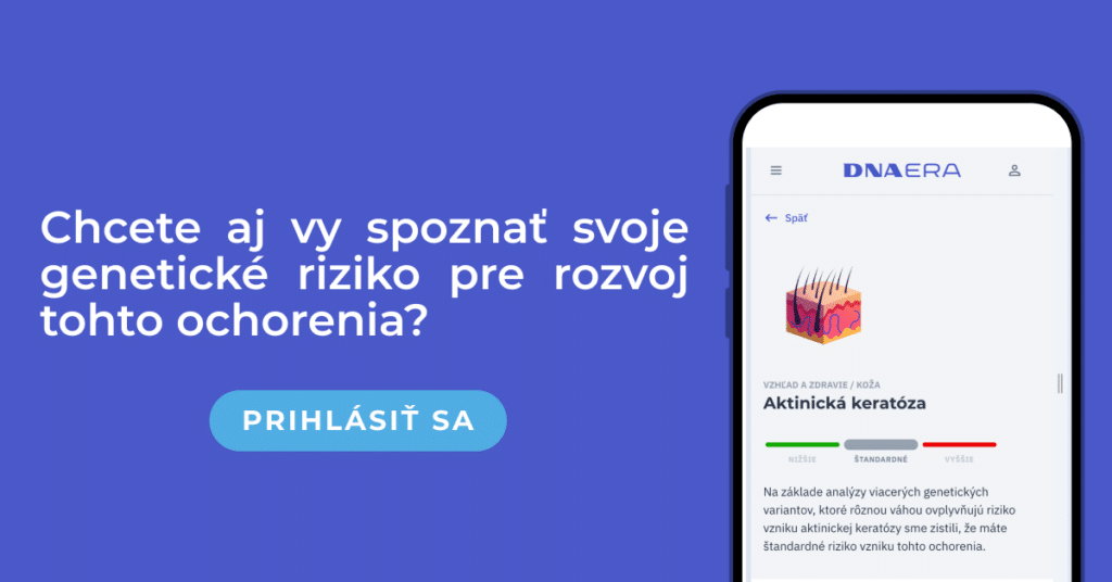 Výsledok aj spolu s ďalšími informáciami týkajúcimi sa aktinickej keratózy je odteraz zadarmo dostupný pre všetkých našich zákazníkov. Prihláste sa do svojho účtu a dodržiavajte základné preventívne opatrenia. Nový výsledok získajú aj všetci budúci zákazníci, ktorí si objednajú DNA Complex test, DNA Beauty test alebo si rozšíria výsledky o kategóriu Vzhľad a zdravie.