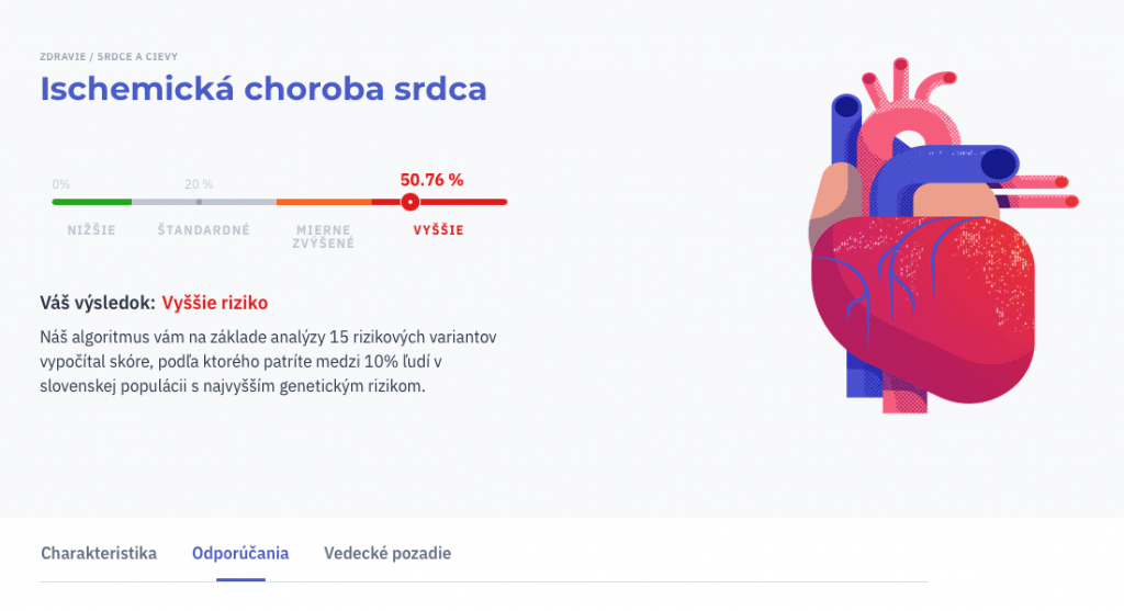 Jednou z našich zásad je sprostredkovať zákazníkom iba tie výsledky, v rámci ktorých im vieme dať odporúčania, personalizované podľa ich genetickej predispozície. Uveďme si to na príklade. Ak zákazníkovi vyjde vyššie genetické riziko na rozvoj ischemickej choroby srdca, okrem charakteristiky ochorenia, jeho spúšťačov a samotných výsledkov zákazníka (s presným zoznamom rizikových miest v jeho DNA), je súčasťou reportu aj záložka s odporúčaniami. Pri ischemickej chorobe srdca si zákazník nájde medzi odporúčaniami napríklad: