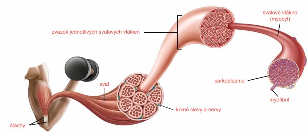 Naše kostrové svalstvo je zložené zo zväzkov jednotlivých svalových vlákien, ktoré odborne nazývame ako myocyty. Každý myocyt obsahuje veľké množstvo tzv. myofibríl, čo sú vlastne reťazce zložené z aktínových a myozínových proteínov. Tieto reťazce sa môžu medzi seba zasunúť ako taký teleskop, čo v konečnom dôsledku spôsobí skrátenie svalu alebo inak povedané, svalovú kontrakciu.