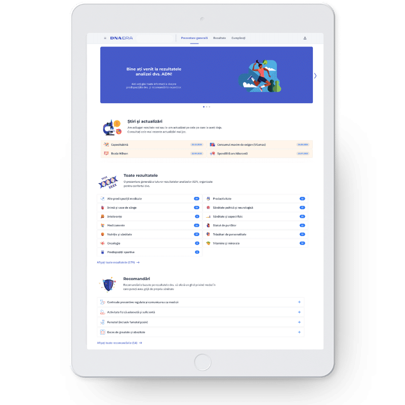 Sistemul de evaluare pe care l-am dezvoltat în colaborare cu geneticieni, medici și analiști de date este utilizat pentru a evalua datele brute (RAW) pe care le primim de la laborator. Evaluarea rezultatelor are loc în Slovacia și, la fel ca analiza ADN în laborator, acest proces se desfășoară prin utilizarea unui cod de identificare unic. Analiza rezultată, precum și datele brute, sunt disponibile pentru clienți în contul lor de pe site-ul web. Vedeți cum ar putea arăta rezultatele dumneavoastră.