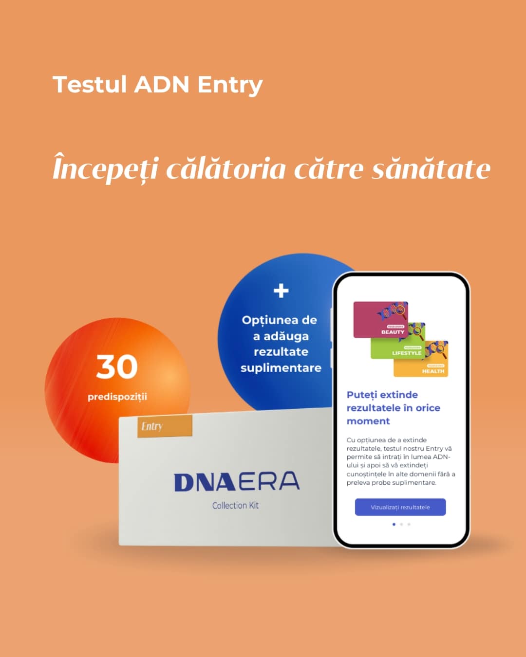 Este timpul să vă cunoașteți ADN-ul. Începeți cu predispozițiile care vă afectează viața de zi cu zi. Am creat un test care vă ghidează prin prima experiență de analiză ADN și vă arată ce puteți afla despre organismul dumneavoastră. Pătrundeți în lumea ADN-ului și decideți mai târziu dacă doriți să achiziționați rezultate suplimentare, fără să fie nevoie să repetați prelevarea de probe.