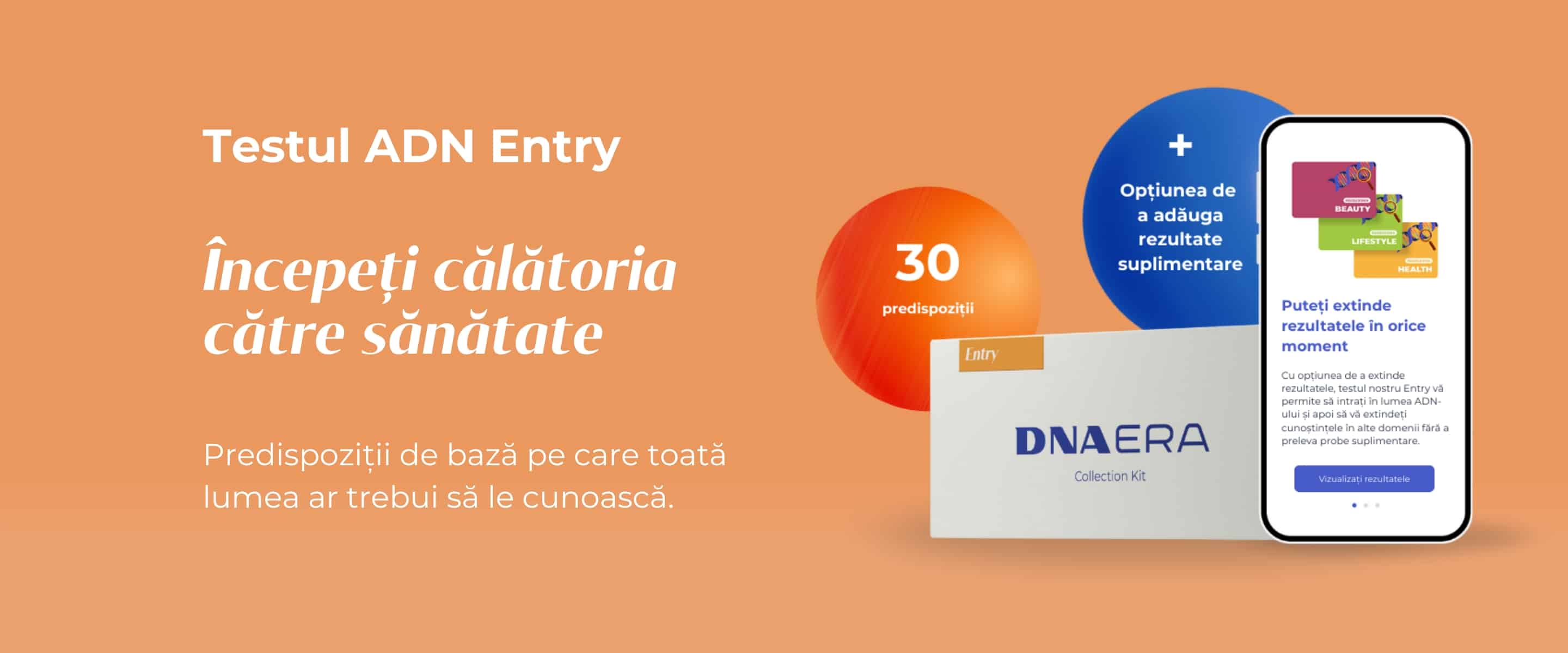 Testul ADN Entry se concentrează pe predispozițiile pe care toată lumea ar trebui să le cunoască. Acest test vă oferă informații despre indicatorii de bază ai stilului de viață, starea de bine și bolile comune în rândul populației. Începeți să vă descoperiți treptat ADN-ul și profitați de posibilitatea de a vă extinde rezultatele ulterior. Puteți găsi o listă cu predispozițiile analizate în cadrul testului ADN Entry mai sus pe această pagină – în secțiunea rezultate.